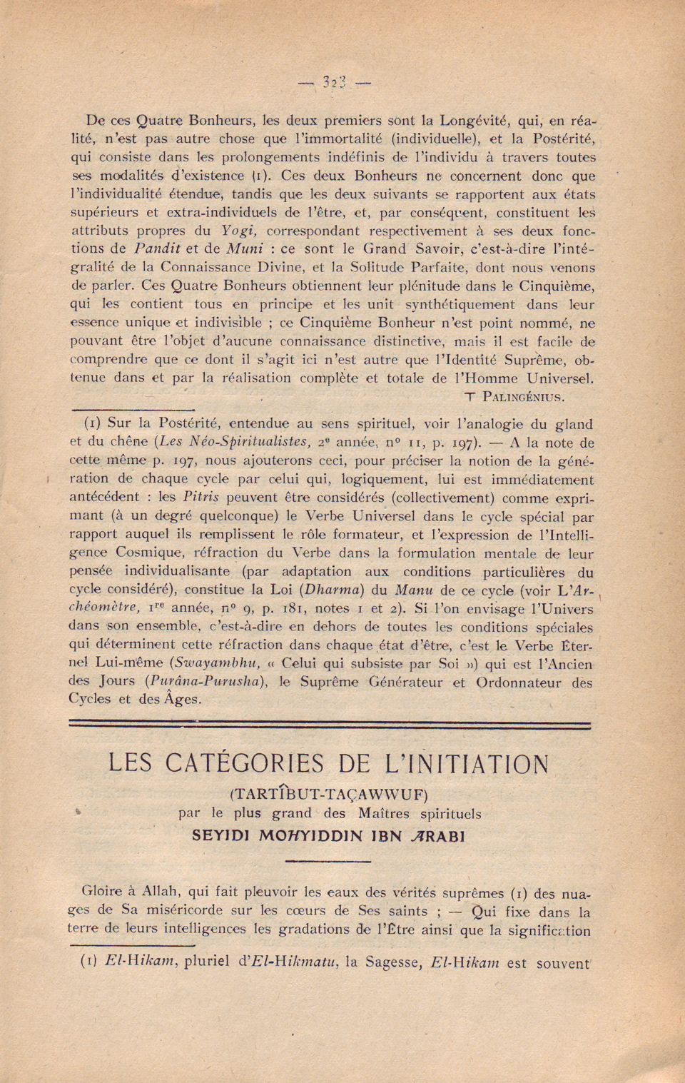 Detta är en översättning av Ivan Aguéli av Ibn Arabis artikel om de fem olika sorternas inititation. Noterna är troligen av Aguéli. Det ser ut som det skulle kunna finnas en fortsättning (”A suivre” i slutet)  men den kom aldrig innan tidskriften lades ned. Skannad efter originalutgåvan i Konstbiblioteket, Nationalmuseum.